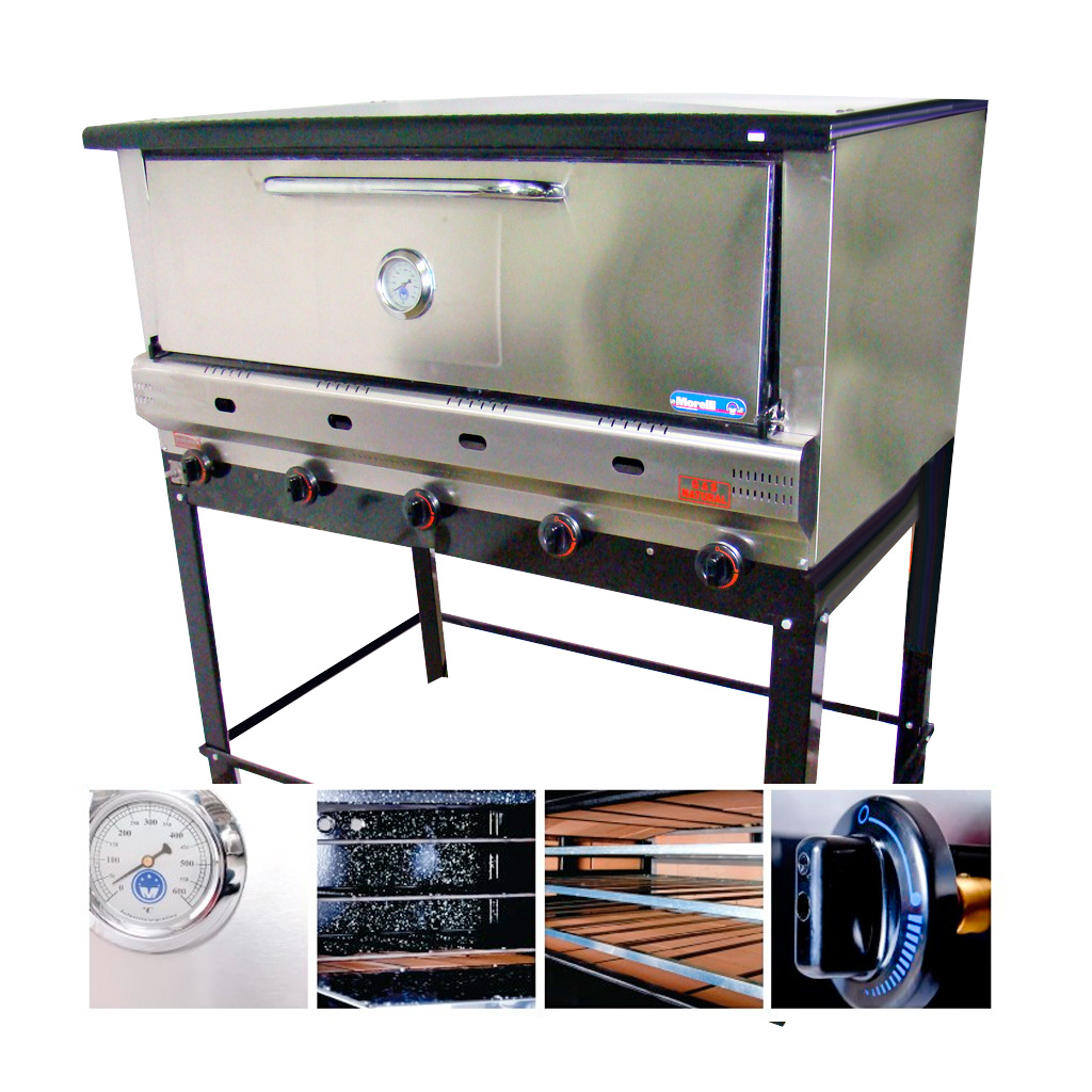 HORNO 12 PIZZAS PASTELERO - MECHERO DE 5 VELAS - 2 ROBINETES - PISO,LATERALES Y FONDO REVESTIDOS DE TEJUELAS REFRACTARIAS - CUERPO ACERO INOX.430 BRILLANTE - BASE Y TECHO ENLOZADOS - BASE SOPORTE REFORZADA DESARMABLE - 3 REJILLAS INT.EXTRAIBLES DE 70 x 71 CM - FR: 84 - PROF: 89 - ALT: 122 - 10.000 CALORÍAS - QUEMADOR DE DOBLE COMANDO
